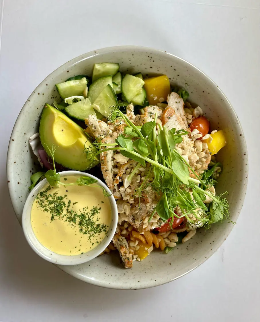 Sallad, pestopasta, mango, avokado, gurka körsbärstomat, rödlök, timjankyckling, cashewnötter & mango/curry dipp.