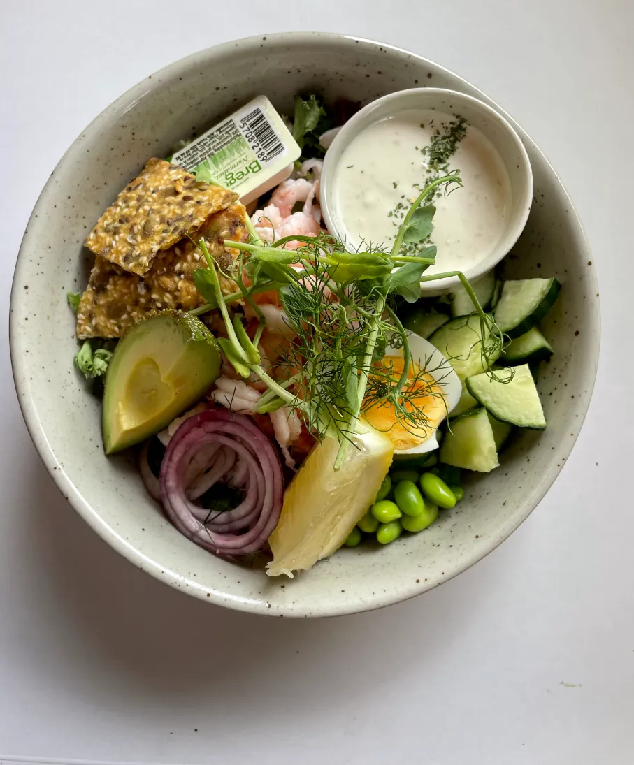 Sallad, gurka, tomat, rödlök, sockerärtor, majs, ägg, avokado, handskalade räkor, fröknäcke & vitlöksdipp.